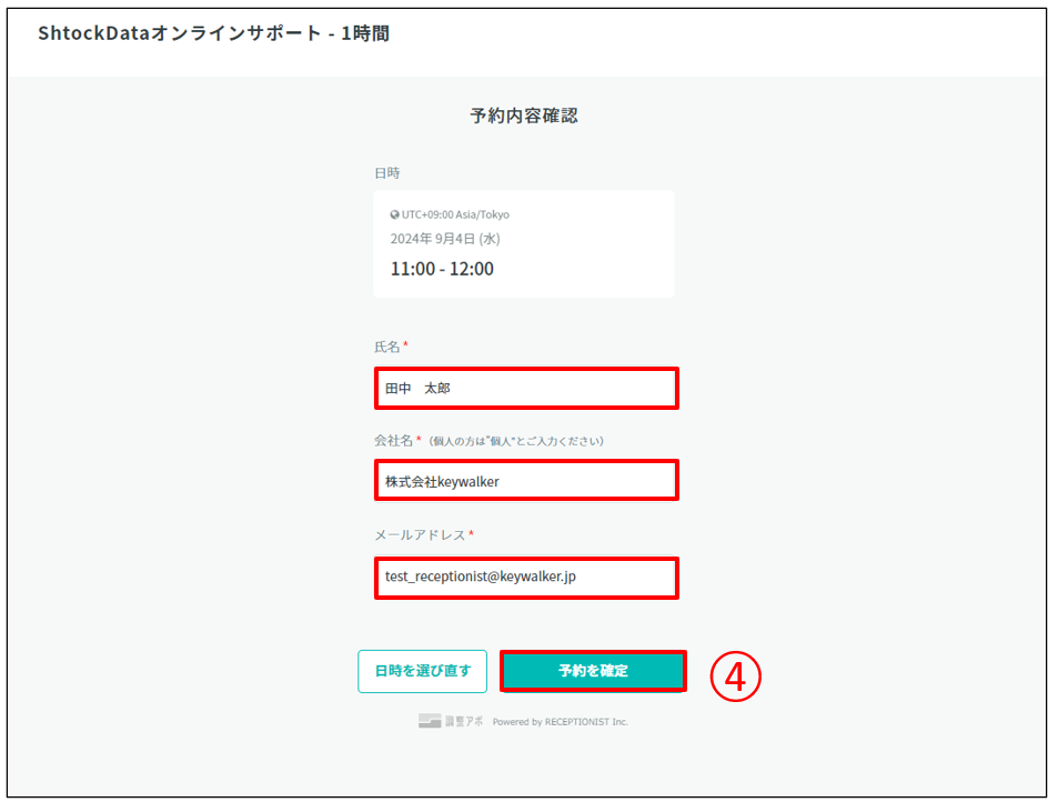 ④オンサインサポート希望者の情報を入力しましたら、予定を確定します。