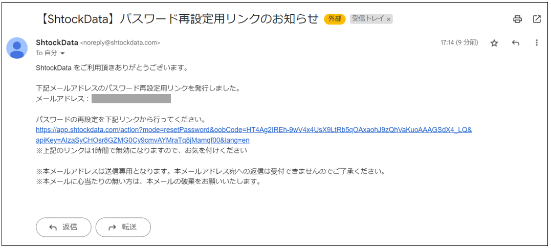 - パスワード再設定のメールに記載されるURLの有効期限は1時間ですのでご注意ください。