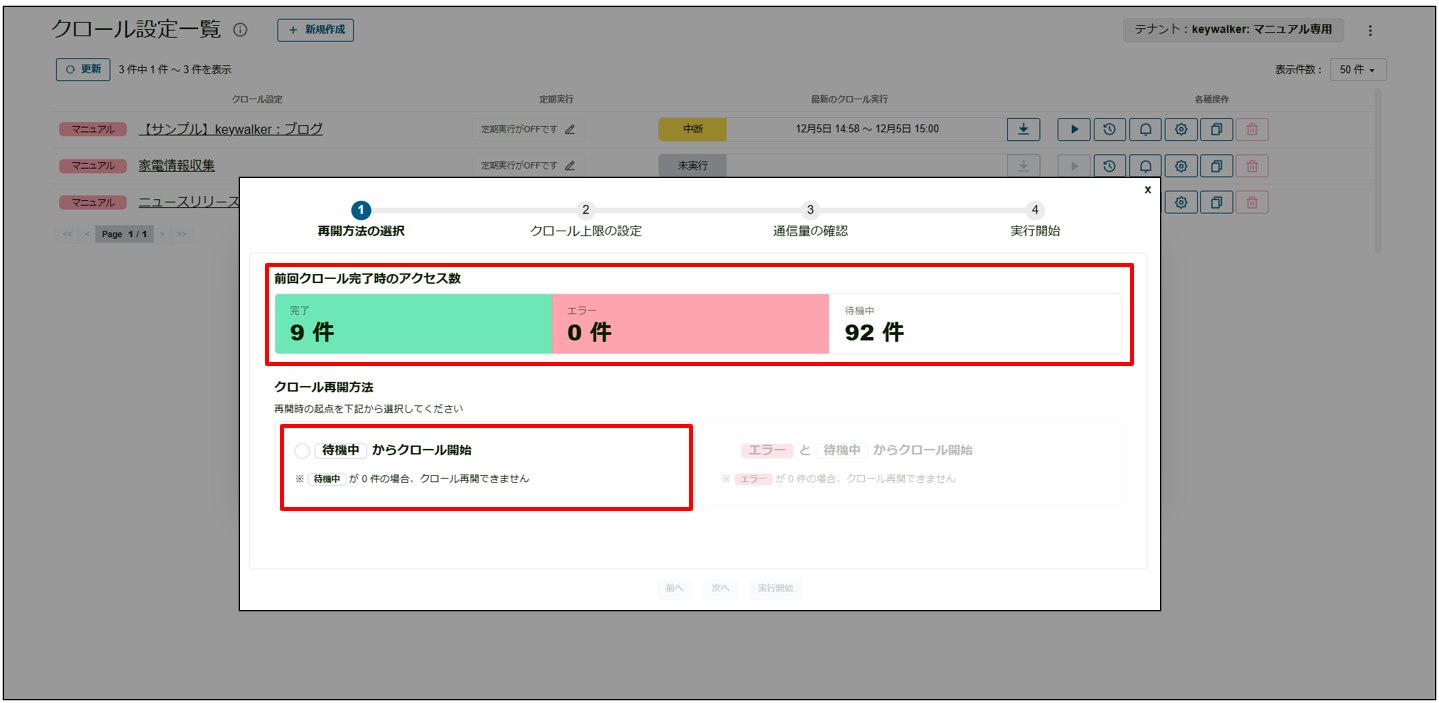 クロール再開方法を選択して次へ進み、実行開始からクロールを再開させます。