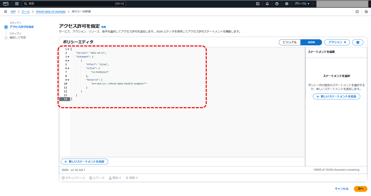 ③ 作成したロールに、対象の Amazon S3 へ PutObject を許可するポリシーを追加してください。