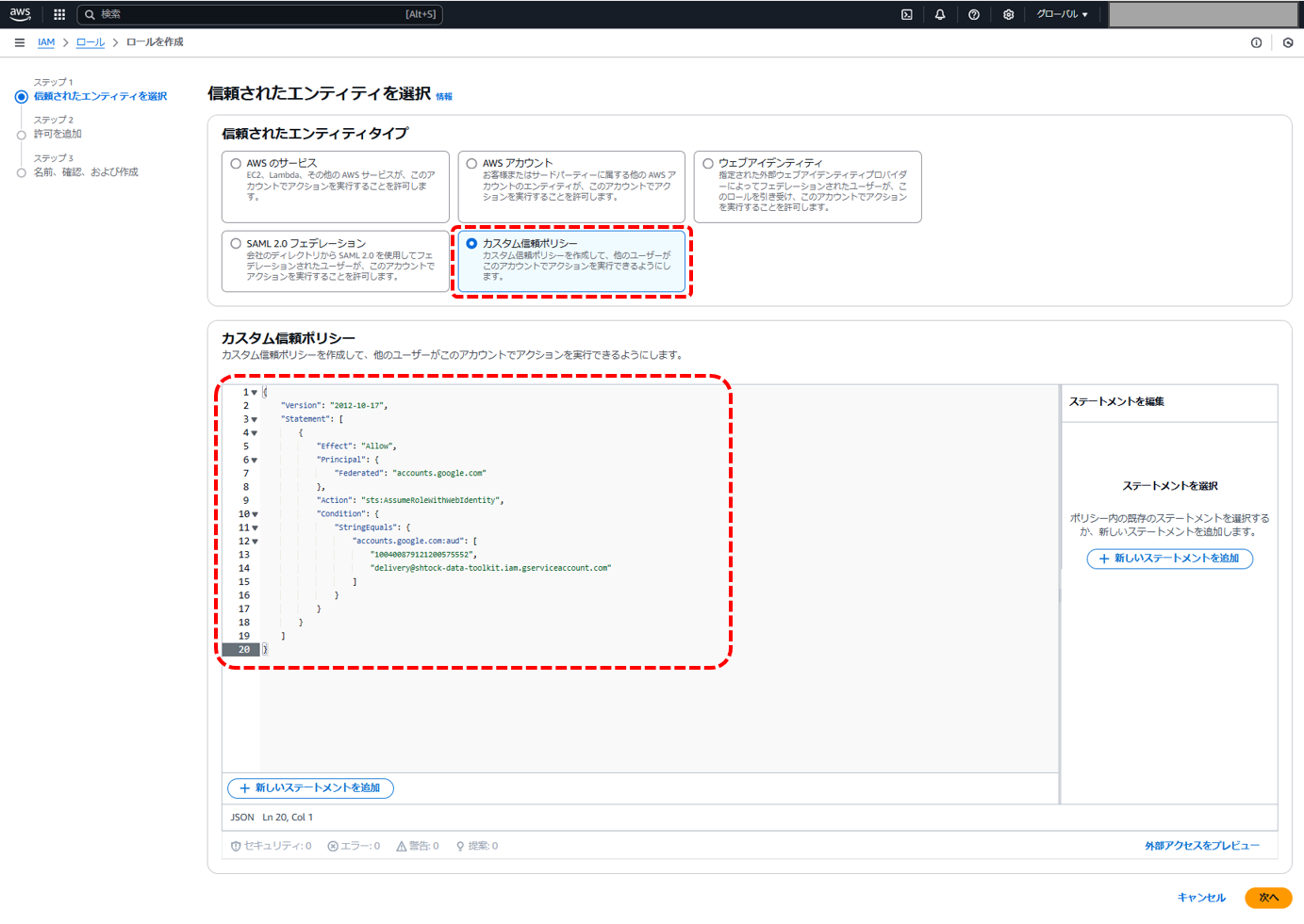 ② 「カスタム信頼ポリシー」を選択し、下記の JSON を張り付けてロールを作成してください。